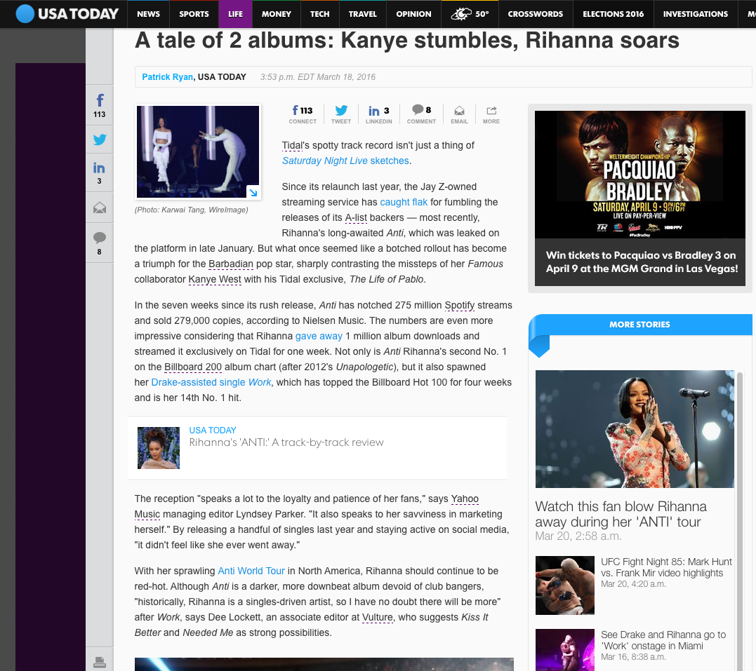 Lyndsey Parker discusses Kanye West and Rihanna’s TIDAL-only albums with USA Today. Full article at http://www.usatoday.com/story/life/music/2016/03/15/kanye-west-the-life-of-pablo-rihanna-anti-tidal-albums/81689256/