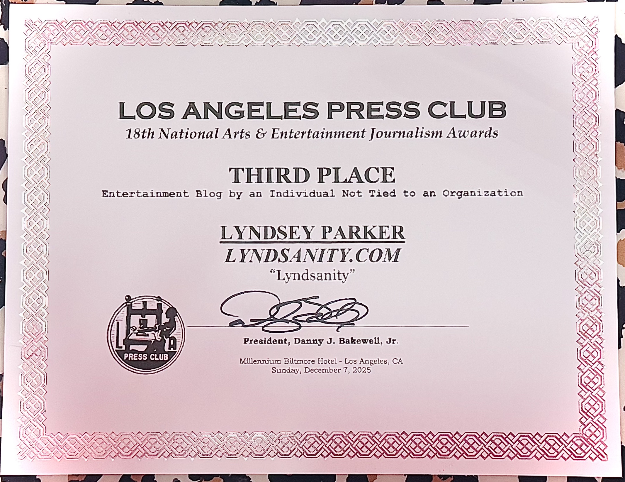 I am thrilled to announce that this here site, Lyndsanity.com, just took home third prize for Entertainment Blog by an Individual Not Tied to an Organization at the Los Angeles Press Club‘s 18th annual National Arts & Entertainment Journalism Awards!